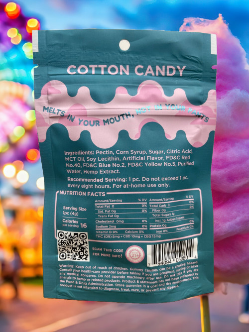 Fluffy, melt-in-your-mouth cotton candy infused with premium legal cannabis for a light, uplifting high. A carnival of flavor and relaxation in every bite!